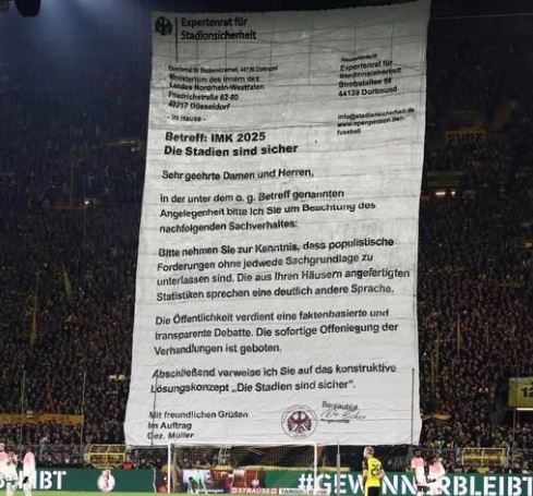 Njemačka Borussia iz Dortmunda je u okviru DFB Kupa dočekala ekipu Bayer Leverkusena. Na samome početku utakmice ,domaći ultrasi su razvukli veliki transparent na kojem je bilo “pismo za MUP”.. Poruka je direktno upućena “Ministarstvu unutarnjih poslova, ali i ostalim nadležnim institucijama, kao dio velike navijačke koreografije u znak prosvjeda protiv najavljenih sigurnosnih mjera.